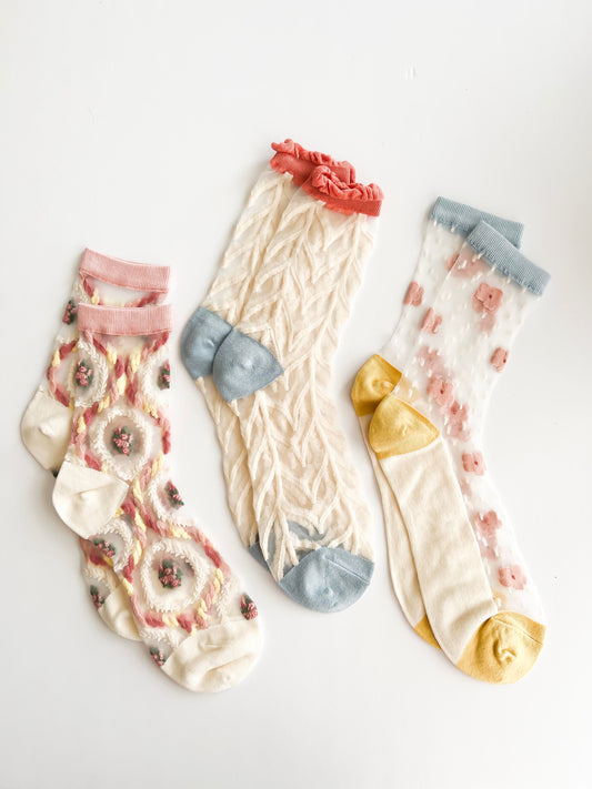 NEW Vintage Sheer Glass Sock Collection | Sheer, Breathable Mesh Socks | Floral, Lace and Embroidery designs
