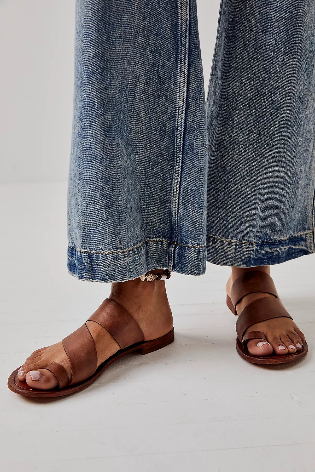 So simple, go-to sandals featured in a buttery soft leather and flat-sole style with wide straps, toe-loop detailing, and a cozy cushioned footbed.