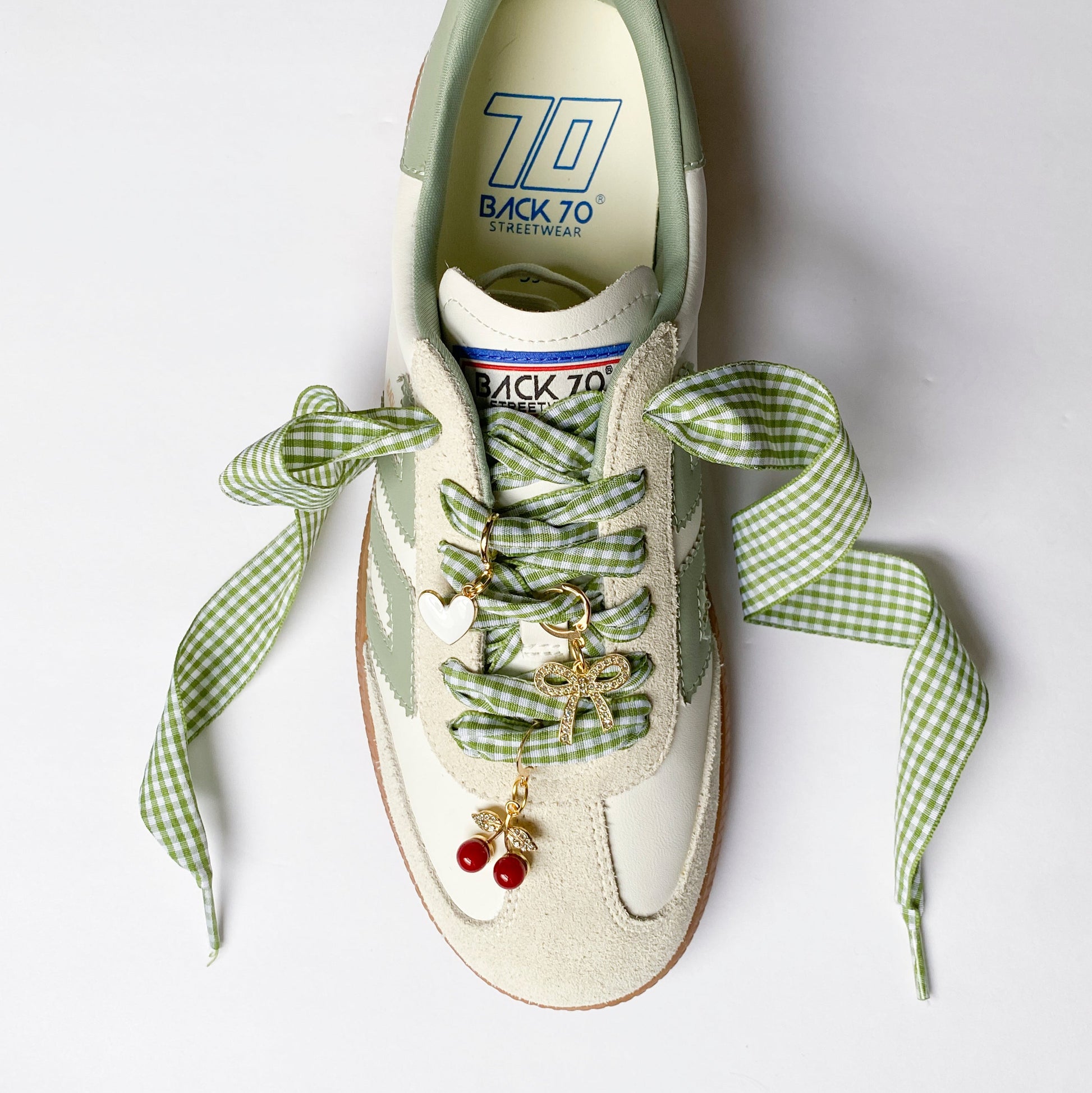 Green Gingham Sneaker Charm Set – Heart, Bow & Cherry Charms