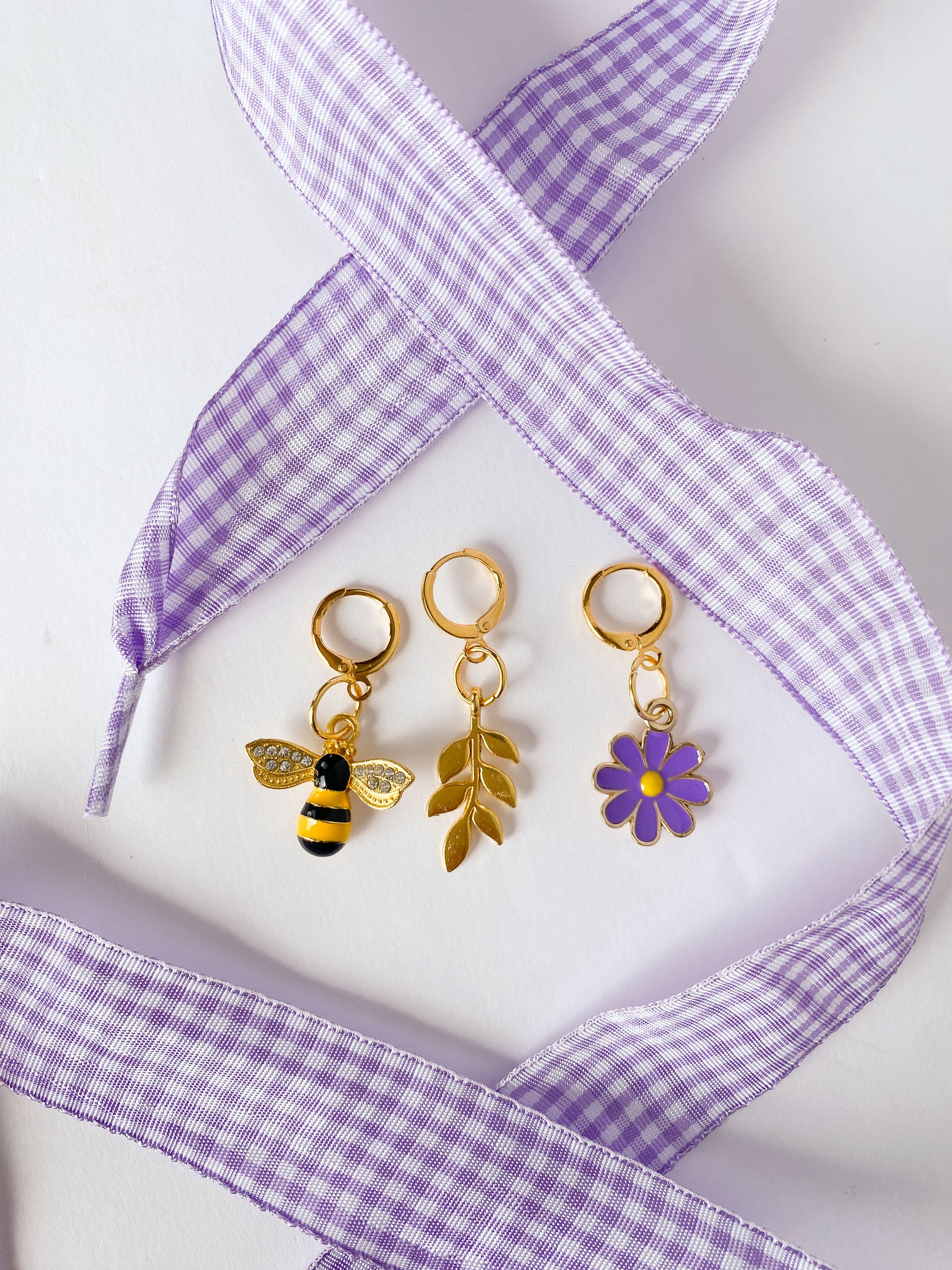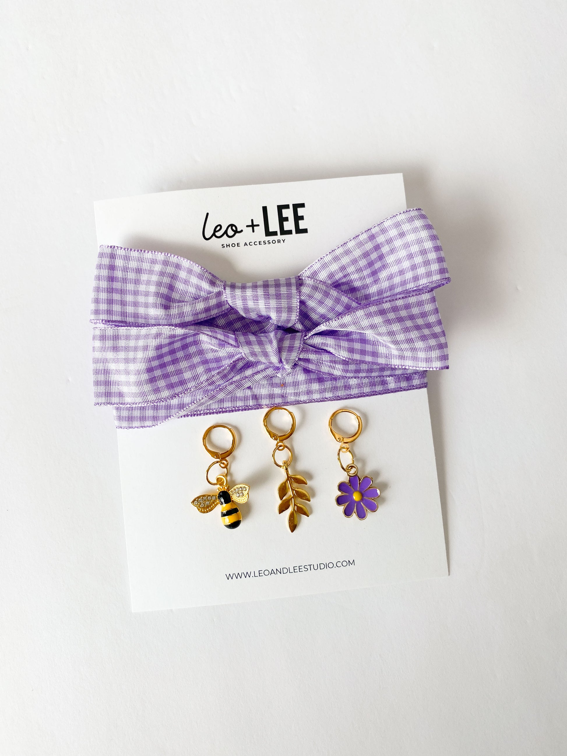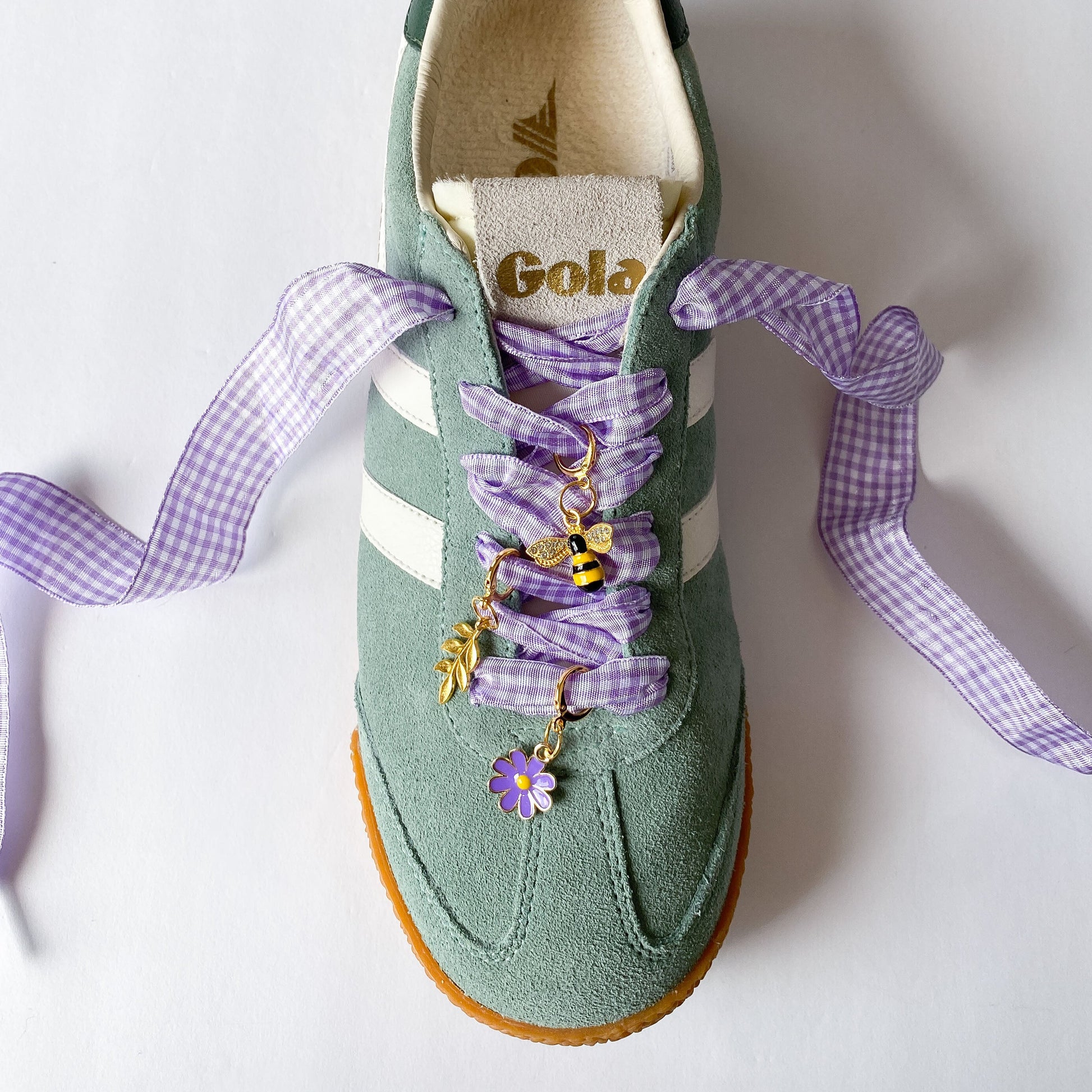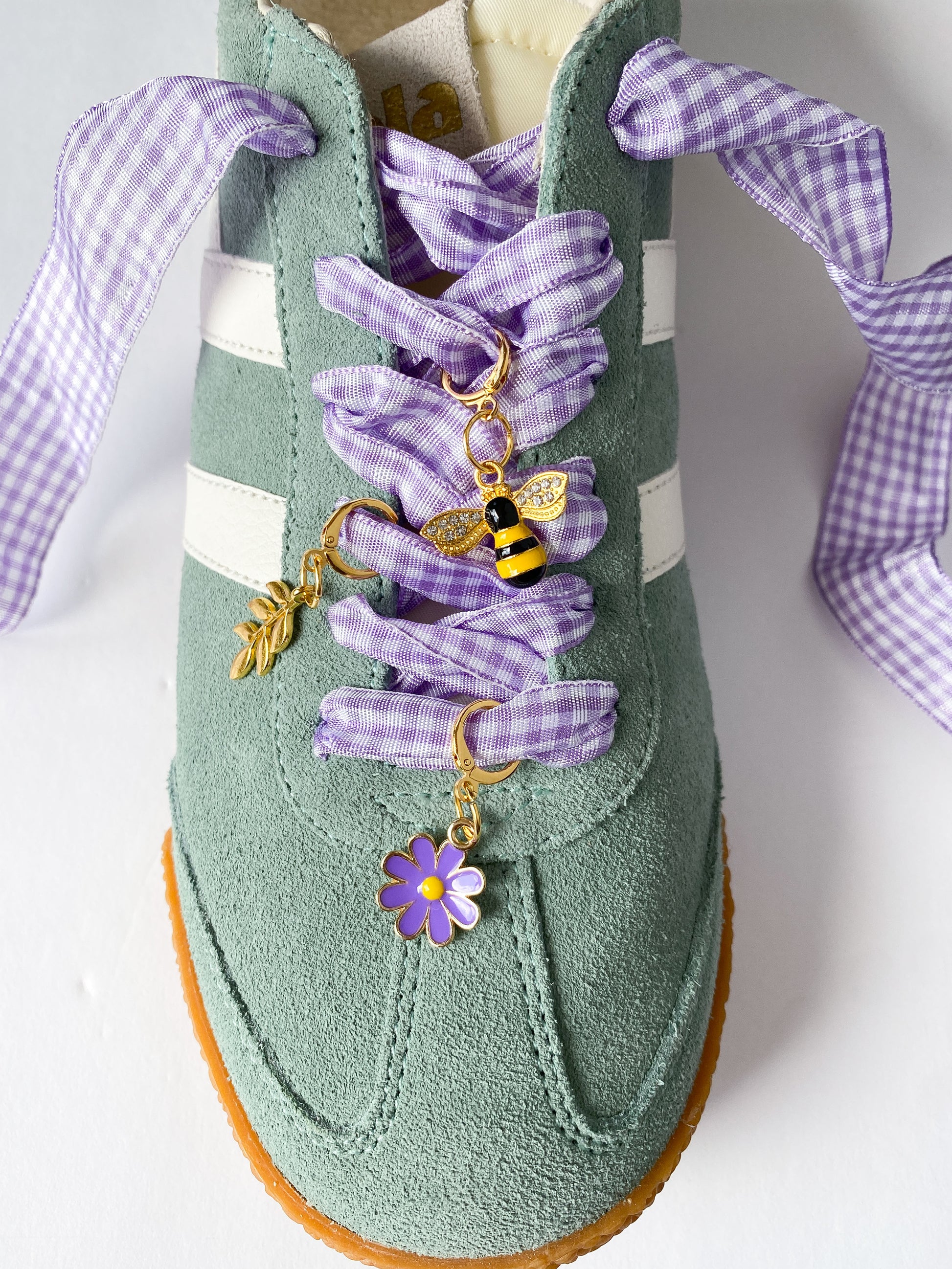 Lavender Gingham Sneaker Charm Set - Bee, Fern & Purple Flower