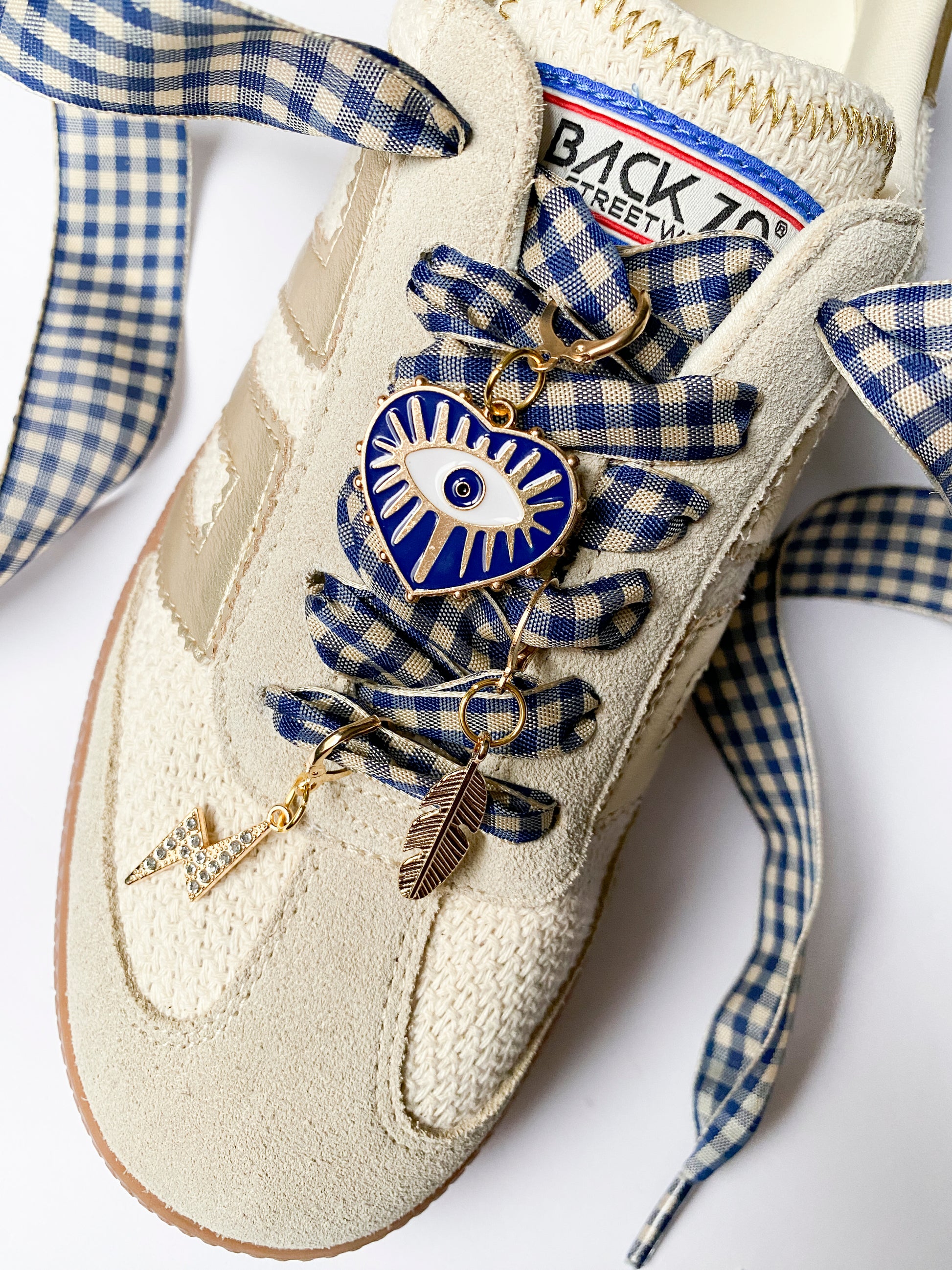 Navy Blue Gingham Sneaker Charm Set – Evil Eye, Feather & Lightning Charms