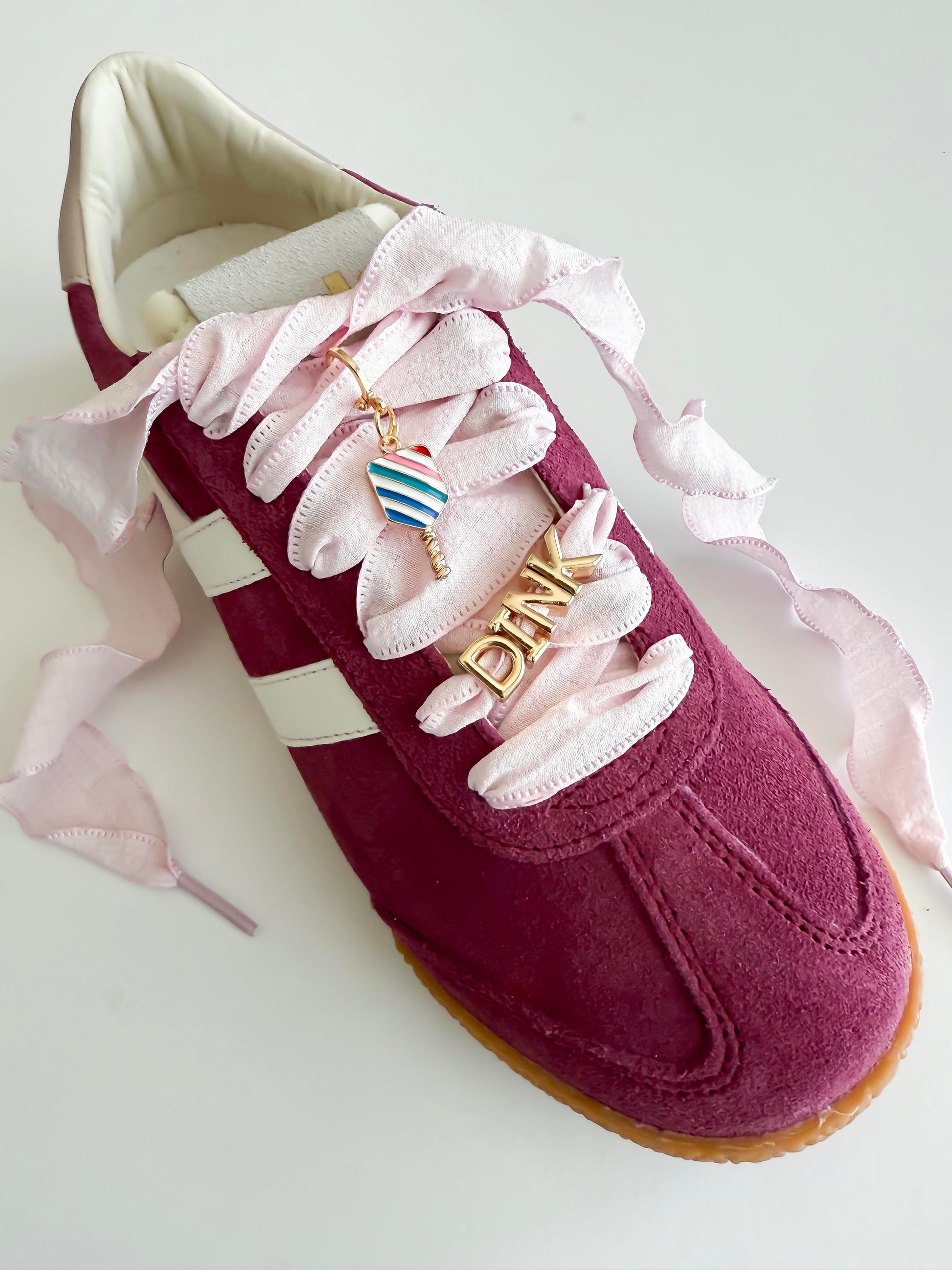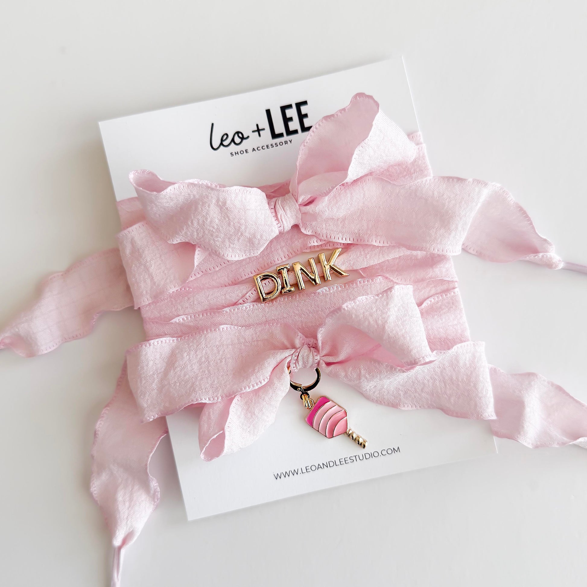 Add some court-side sass to your sneakers with our Pickleball Sneaker Charm Set! Featuring luxe pink ribbon laces, a gold “DINK” letter charms, and a cute paddle charm, this set is perfect for pickleball lovers who want to bring the fun from the court to their kicks.