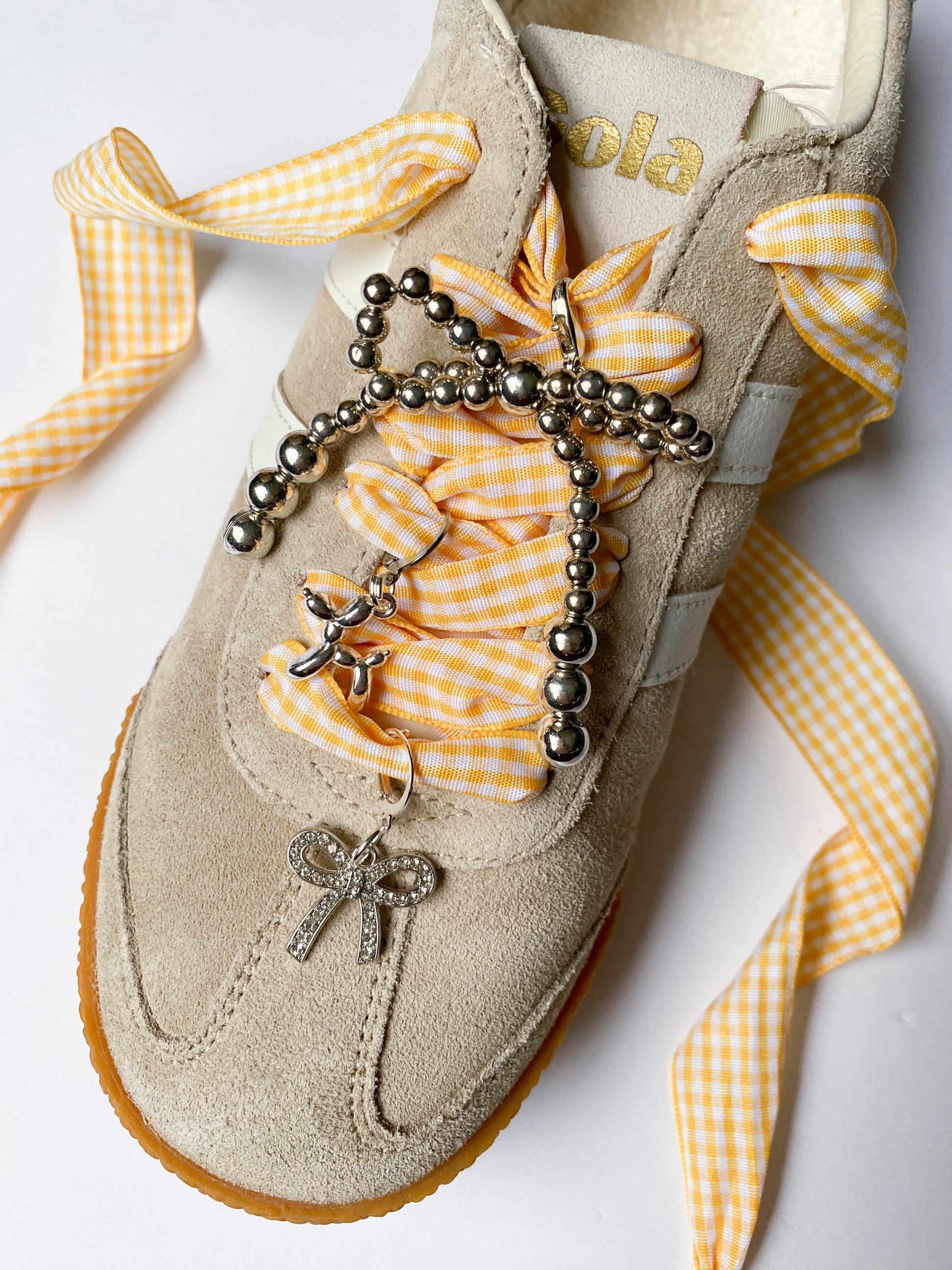 Bring cheerful vibes to your sneakers with our Yellow Gingham Sneaker Charm Set. This set includes a pair of bright yellow gingham checkered laces and two playful silver charms—a sparkling bow and a balloon dog—paired with a silver beaded bow for extra style. The charms slide easily clip onto the laces, letting you mix and match to create your own look. Perfect for sneaker lovers, teens, and anyone who loves fun accessories, this set adds a sunny pop of color to any pair of kicks. The yellow gingham design makes it ideal for spring, summer, and festival looks, while also being a unique gift for fashion-forward friends.